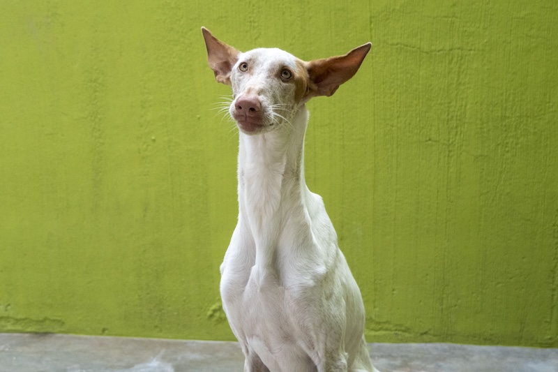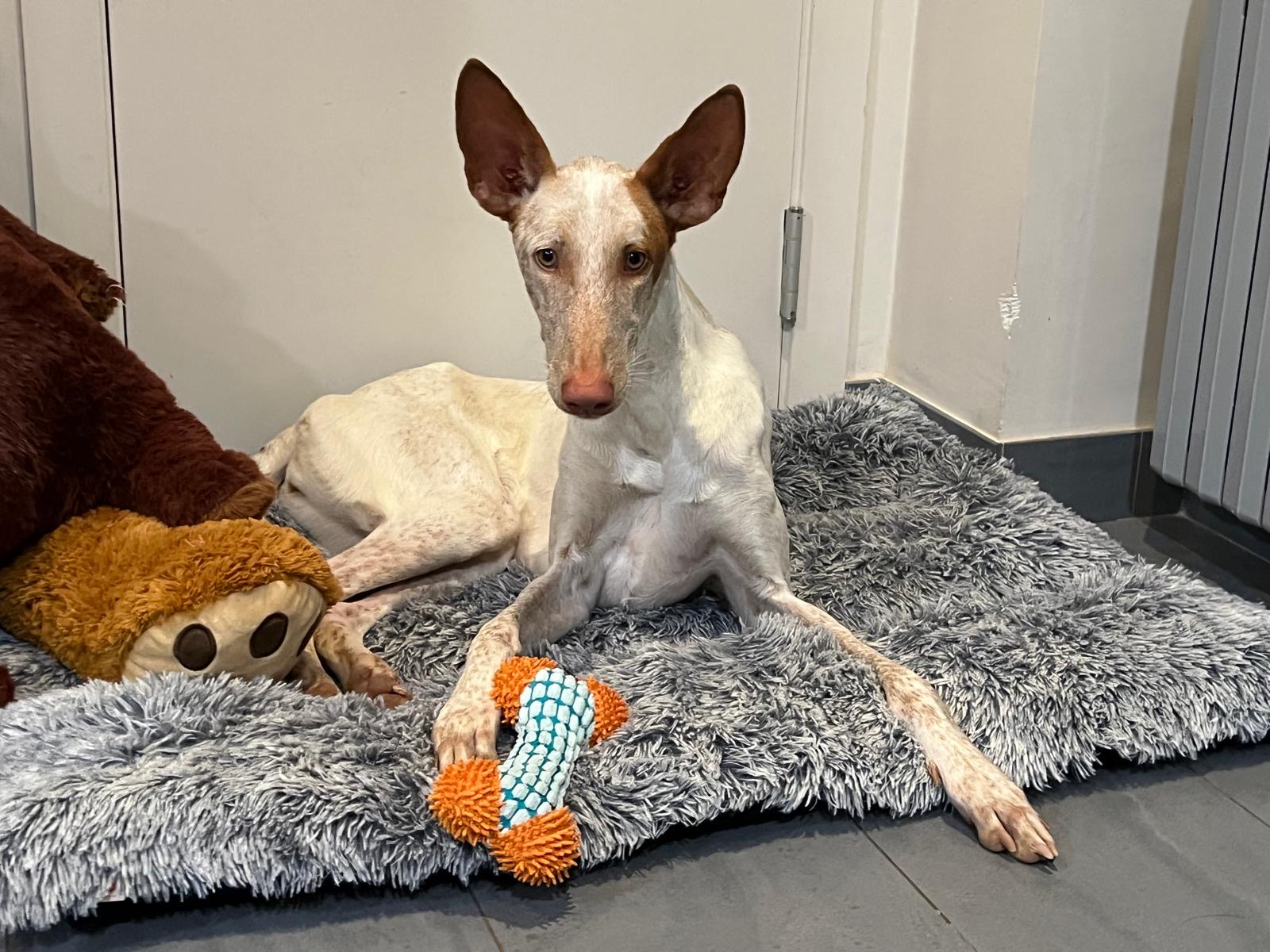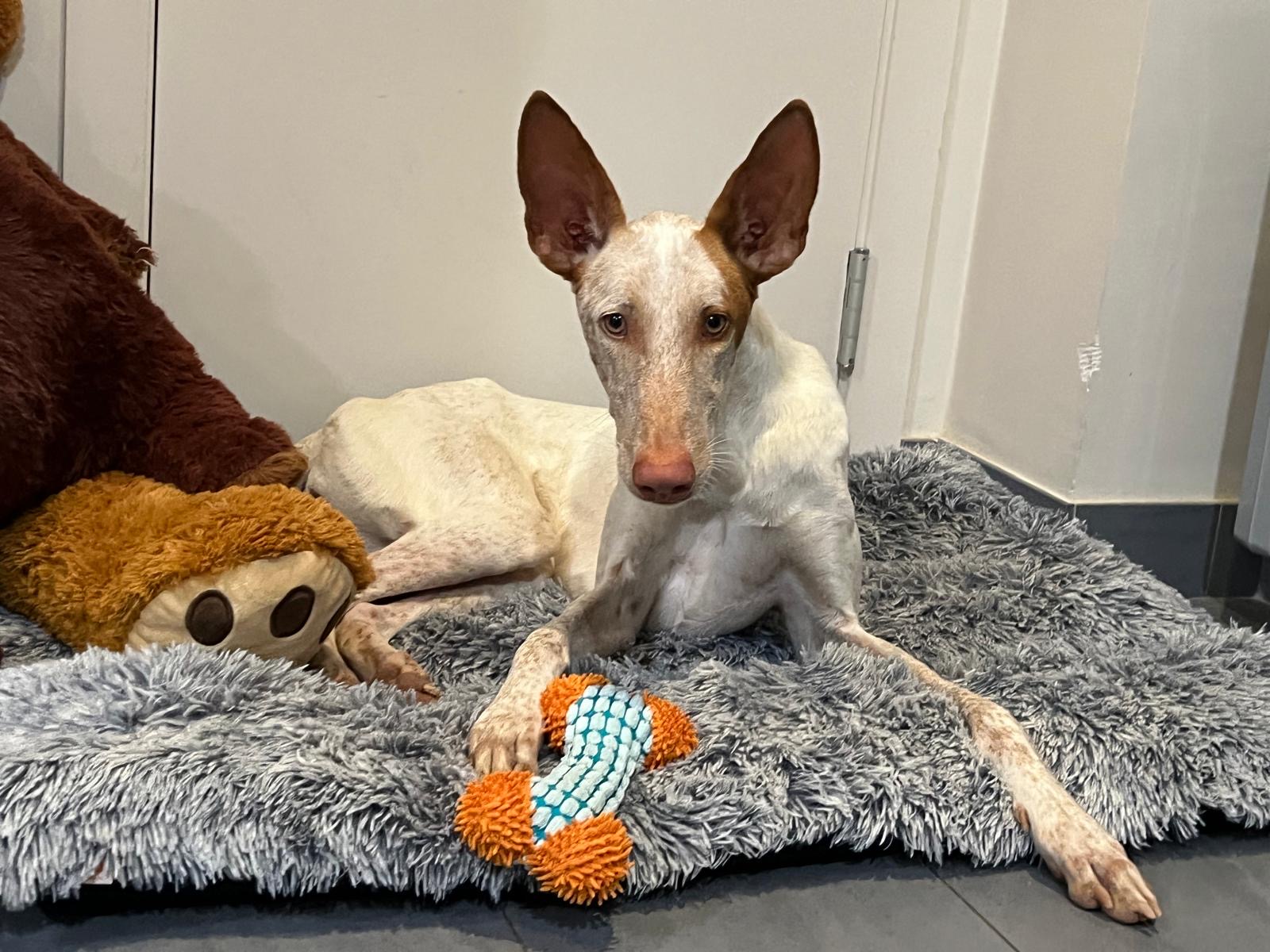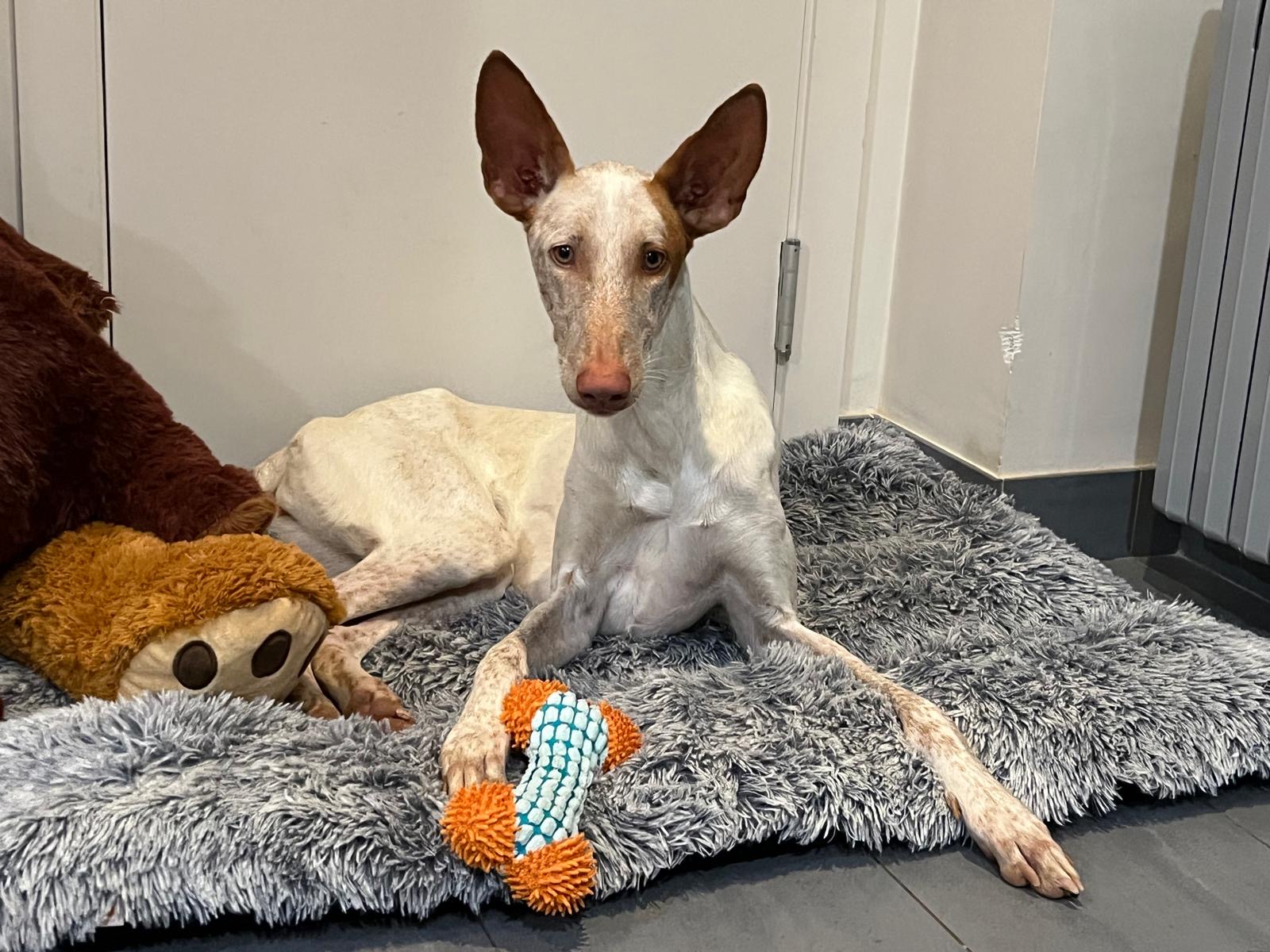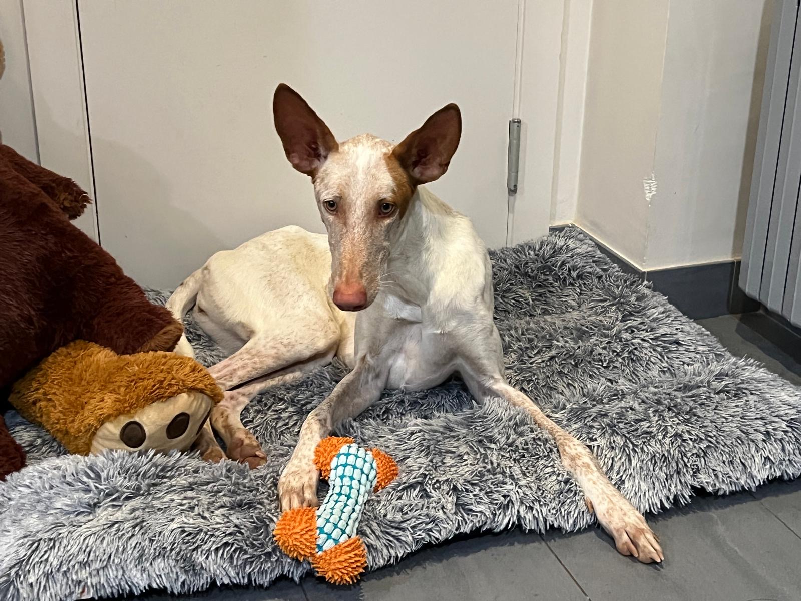 SIRI es una preciosa podenca que pesar de sus grandes orejas no oye nada. Es sorda de nacimiento. SIRI es muy confiada, simpática, bromista, alegre, activa y aunque esté sorda se entera de todo. Es un trasto y es casi imposible reñirla. Por una parte porque si tira o rompe algo como no oye el ruido, no se da cuenta si ha hecho algo malo. Por otra parte, es tan cariñosa y zalamera que desarma